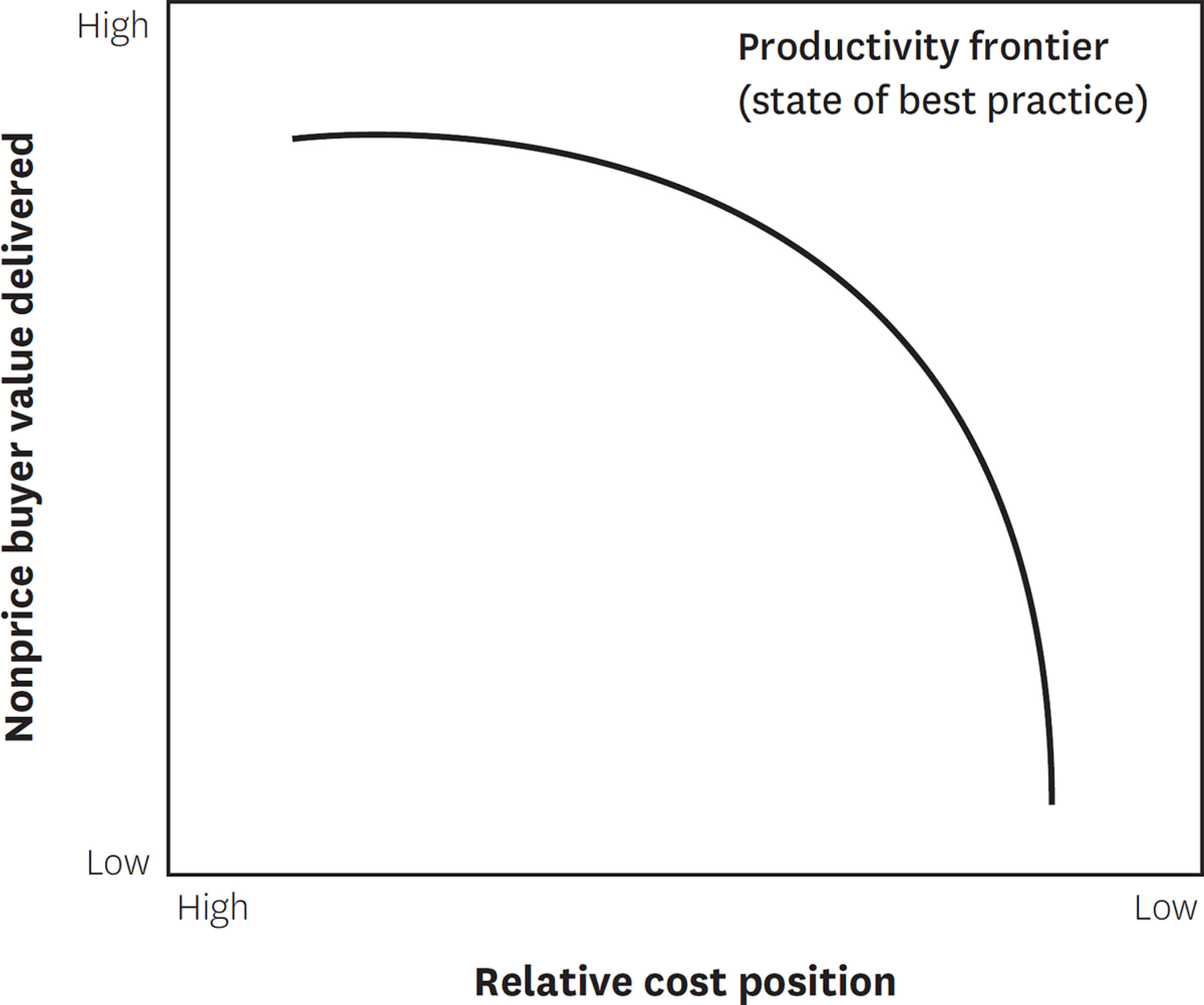 Ключевой темой статьи Портера является концепция Границы продуктивности" (Productivity Frontier), которая описывает максимальное конкурентное преимущество, которого может достичь бизнес, когда он полностью использует операционную эффективность и стратегическое позиционирование.По словам Портера, «Граница продуктивности» представляет собой сумму всех существующих лучших практик на конкретном рынке. Она отражает максимальную ценность, которую компания может создать при заданных затратах, используя лучшие доступные технологии, навыки, методы управления и приобретенные ресурсы.